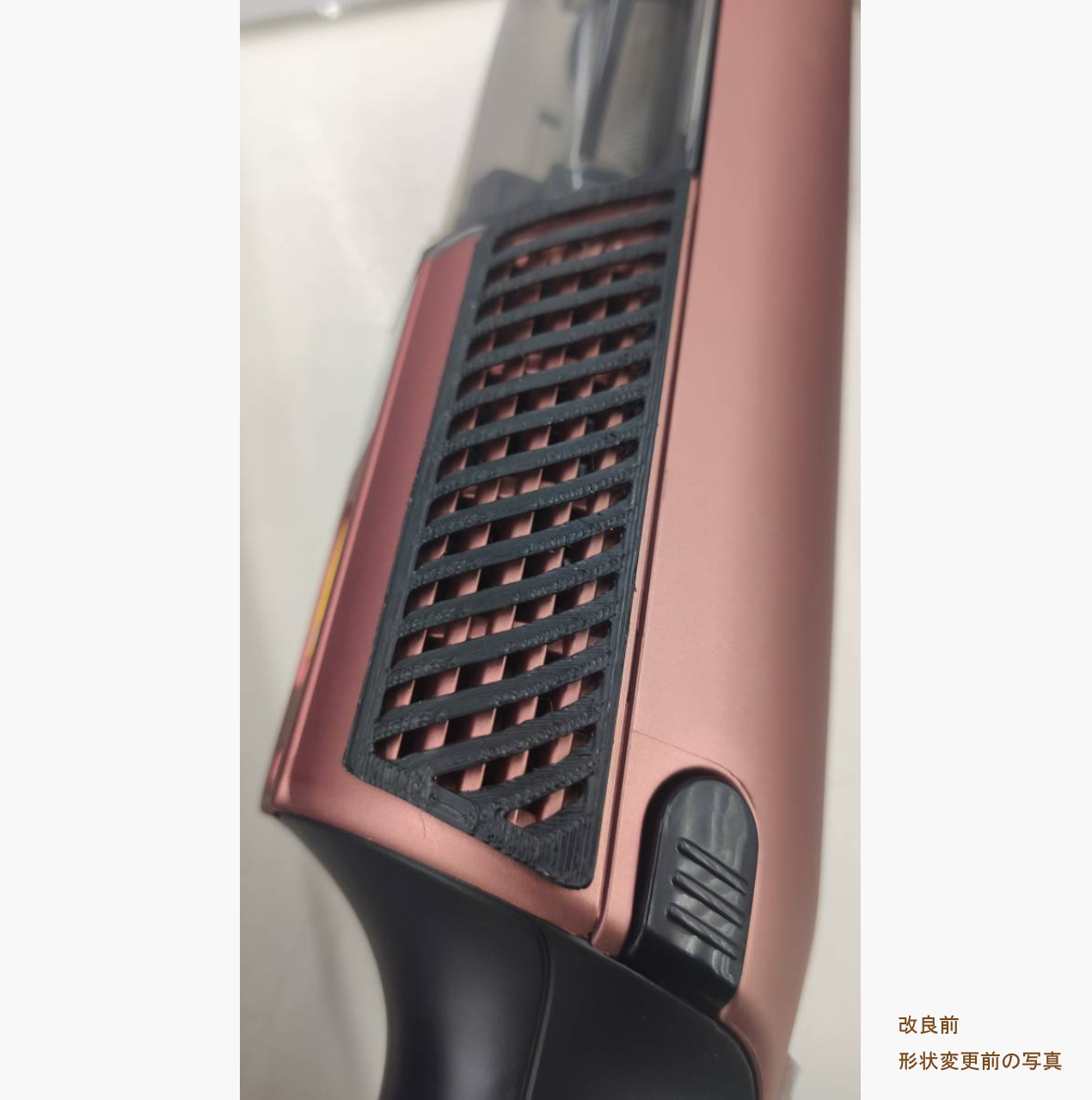 Sharkスティッククリーナーで吸引した排気は、掃除機本体の左右2箇所から真横に排気するために、ゴミが排気風で巻き上がりゴミをばらまいてしまうため、排気方向を後方の握り手側に向きを変え、ゴミの散乱を防止するパーツです。